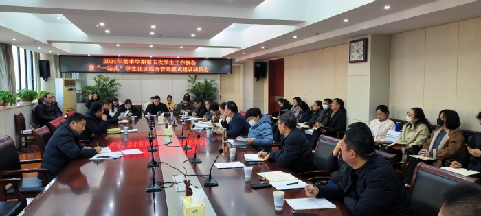 為部署期末學生工作,謀劃2025年“一站式”學生社區建設工作,1月6日下午,學校召開秋季學期第五次學生工作例會暨“一站式”學生社區綜合管理模式建設動員會。相關職能部門負責人,各學院黨委書記、副書記、學工辦負責人,各物業公司負責人參會,會議由學生處處長丁增云主持。