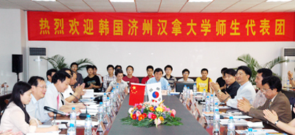 韓國濟州漢拿大學建于1969年,是韓國特色化大學,尤其在計算機科學、旅游與酒店管理、經濟學的專科培養上,采用了S-PBL(問題中心學習法)。我院與漢拿大學計算機專業第一批以“2+2”方式合作辦學方式培養的計算機軟件專業學生已于2006年3月來我院開始為期2年的學習,預計今年9月還將有12名韓國學生來肥學習。此次,漢拿大學RFID產業團團長、計算機信息應用系主任金炯洙教授一行來訪主要是就漢拿大學學生準備來合肥學院計算機系進行本科學歷教育事宜進行商洽交流。在談到留學生學習問題時,金炯洙教授勉勵大家要勇于挑戰自我,挑戰世界,讓夢想在合肥與濟州實現雙贏。