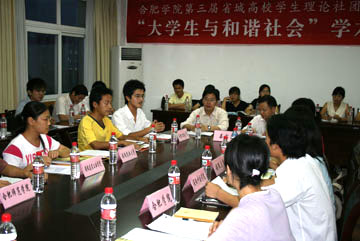 各與會高校學(xué)生社團(tuán)負(fù)責(zé)人積極發(fā)言。有的代表從理論層面論述了建設(shè)社會主義和諧社會的必要性和重要性,倡導(dǎo)應(yīng)加強(qiáng)學(xué)習(xí),從身邊小事做起,為建設(shè)和諧社會貢獻(xiàn)力量。有的代表則結(jié)合自身社團(tuán)實(shí)際,談到以“農(nóng)民工”和“醫(yī)療衛(wèi)生”等為主題開展的一系列構(gòu)建社會主義和諧社會的實(shí)踐活動。我院社團(tuán)代表則介紹了組織60余名社團(tuán)成員到海恒社區(qū)和蓮花社區(qū)的調(diào)研情況,并用詳實(shí)的數(shù)據(jù)分析了社區(qū)居民收入、兒童受教育、社區(qū)外來務(wù)工者處境、城鄉(xiāng)醫(yī)療保障等方面所存在的不和諧現(xiàn)象,并提出了建議和對策。在近三個小時的會議期間,與會代表通過論文交流、自由討論的方式,深入交流了學(xué)習(xí)科學(xué)發(fā)展觀和參與和諧社會建設(shè)實(shí)踐活動的收獲與體會,加深了對貫徹落實(shí)發(fā)展觀和諧社會建設(shè)的認(rèn)識。較之前兩屆的合肥學(xué)院省城高校學(xué)生理論社團(tuán)學(xué)術(shù)交流會,本屆交流會參與社團(tuán)數(shù)和參會理論社團(tuán)代表數(shù)都超過了往屆,同時省城八大本科高校的理論社團(tuán)全部應(yīng)邀派代表到會,此項(xiàng)活動的影響面日益擴(kuò)大。