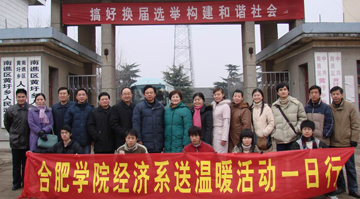 2007年元旦,新年第一天,由我院經濟系副主任陳莉副教授、黨總支副書記賀詒芝帶隊的師生一行20多人,冒著嚴寒,驅車100多公里來到滁州市黃圩鄉,為黃圩鄉的困難群眾及敬老院的老人們送去了經濟系全體師生的捐款和贈物,在寒冷的冬季為他們送去溫暖。同時經濟系師生還在那里進行了社會主義新農村建設的考察活動。