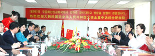接著,金夏中大使來到禮堂,為我院近1500名師生作“攜手共創(chuàng)中韓關(guān)系美好未來”演講。金夏中大使在演講前幽默詼諧地解讀自己的名字說:“夏即華夏的夏,中即中國(guó)的中,說明我與中國(guó)很有緣分。”2002年,金夏中大使曾經(jīng)訪問過安徽,通過這次訪問,他覺得安徽的變化很大。他說,非常珍惜這次訪問機(jī)會(huì),安徽出了很多名人,韓國(guó)與安徽的交流處于起步階段,想多走走看看,多了解安徽,安徽為中國(guó)的改革開放作出過很多貢獻(xiàn),也反映了安徽人民的精神。他在演講中從韓國(guó)的經(jīng)濟(jì)發(fā)展,韓劇《大長(zhǎng)今》、《我的野蠻女友》等曾在中國(guó)流行的韓國(guó)電視劇談到韓國(guó)的飲食和電子、汽車工業(yè);從中國(guó)的滾滾“韓流”和韓國(guó)的陣陣“漢風(fēng)”談到韓中文化的交互融合;從他個(gè)人學(xué)習(xí)漢語和出任駐中國(guó)大使談到他與中國(guó)的不解之緣;從韓中的發(fā)展歷史談到中國(guó)國(guó)家主席胡錦濤訪問韓國(guó)時(shí)與韓國(guó)總統(tǒng)盧武鉉達(dá)成的共識(shí)“在政治上,中韓兩國(guó)應(yīng)該成為不同社會(huì)制度國(guó)家和平共處的典范。”
