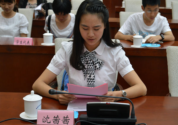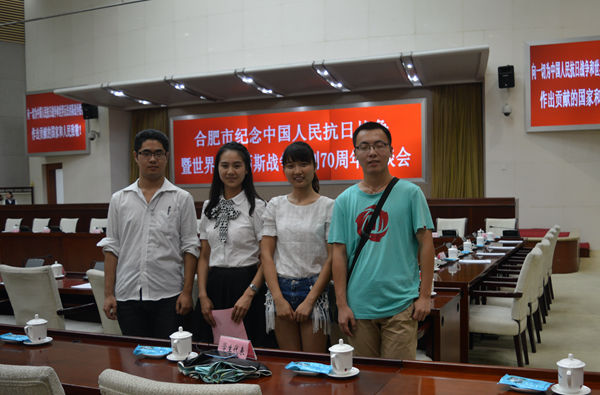 9月6日下午,合肥市紀念中國人民抗日戰爭暨世界反法西斯戰爭勝利70周年座談會在市政務中心召開。省委市委領導出席會議并講話。我校沈茜茜、程壽月、董浩、袁眾、常文玉五位同學作為合肥市大學生代表參加了會議,沈茜茜并代表全市大學生在座談會上進行了發言。