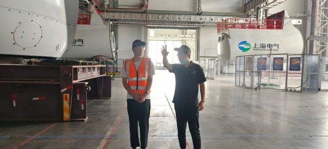 圖為上海電氣風電設備莆田有限公司工作人員帶領調研成員參觀工廠車間