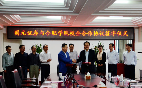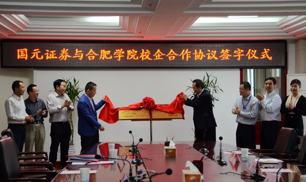 張文兵介紹了學校的發展歷史、國際化辦學、教育教學改革與創新等方面的舉措和取得的成果,指出了加強校企合作對于提升我校經管專業應用型人才培養質量的重要性。俞仕新介紹了國元證券股份有限公司的發展,認為合肥學院應用型人才培養模式完全符合證券公司業務綜合性、多元化的發展趨勢和公司營業網點相關崗位的工作需求。雙方就人才培養、投資者教育、專業建設等領域的合作達成一致意見,簽署了校企合作框架協議,共同為合作基地揭牌。最后,雙方均表示要以協議簽署為契機,攜手共進,共謀發展。