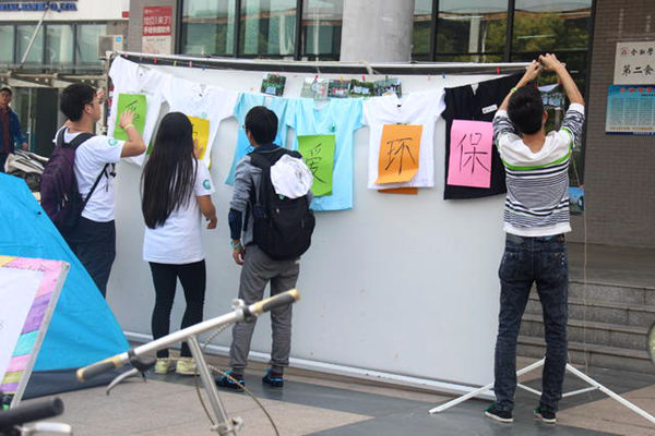 大學(xué)生環(huán)保協(xié)會(huì)通過(guò)提供空白環(huán)保袋,邀請(qǐng)學(xué)生們手工繪制圖案,畫(huà)出自己心中的環(huán)保理念,吸引了眾多學(xué)生的目光。學(xué)生畫(huà)好后環(huán)保袋,可自行帶回使用,減少一次性購(gòu)物袋的使用。而由6件各異的文化衫制成的環(huán)保綠色橫幅更令人倍感新鮮。據(jù)了解,這些文化衫均是與外校環(huán)保協(xié)會(huì)合作交流后外校所贈(zèng)。同學(xué)們?cè)趯?xiě)有“愛(ài)生活,愛(ài)環(huán)保”字樣的卡片上留下了的簽名。與此同時(shí),環(huán)協(xié)還展示了往屆廢物利用工藝作品以及環(huán)保創(chuàng)意大賽獲獎(jiǎng)作品。“我在皖南醫(yī)學(xué)院祝合肥學(xué)院大學(xué)生環(huán)保協(xié)會(huì)招新成功,在環(huán)保路上一路同行,越走越遠(yuǎn),共圓美好夢(mèng)想……”由重慶大學(xué)、四川大學(xué)、新華學(xué)院等19所省內(nèi)外高校共同參與錄制的祝福的話語(yǔ)同時(shí)在現(xiàn)場(chǎng)播放。