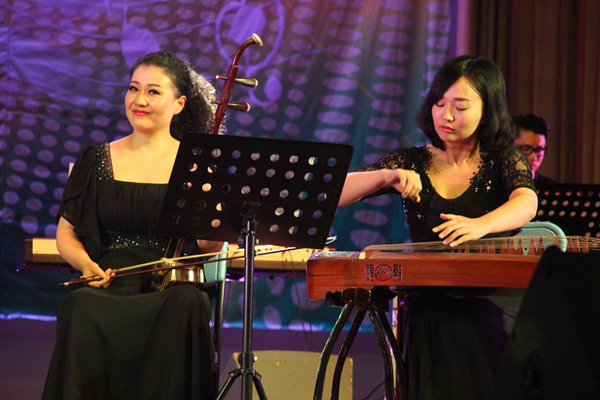 音樂會在悠揚的二胡聲中拉開帷幕,開場的第一曲新民樂《加勒比海盜》讓人感受到古典樂器與現代樂器的碰撞所帶來的美感與力量,舞臺燈光隨節奏閃爍,臺下聽眾的心情也跟著音樂徜徉。節奏感極強的搖滾樂《無所顧忌》,輕松活潑的《Crazy》富有感染力的旋律,動感時尚的節拍,時而喧囂激昂錚錚跳躍,時而柔媚婉轉低吟淺唱,時而激越迸發金鼓齊鳴,時而萬籟俱寂煙消云散,無不張揚著青春與活力,使現場氣氛再次升溫。身著白底藍花點綴禮服的徽姑娘組合將黃梅戲《對花》注入流行音樂因素,別有一番風味。著名美聲藝術家閆曉光帶來的獨唱《今夜無人入睡》,用他極富穿透力的渾厚嗓音,絕佳的演唱技巧,深情講述著唯美的故事,吸引著現場的觀眾。第二季《中國好聲音》汪峰組學員倪鵬更是帶來自創歌曲《此時此刻》,歌聲率性灑脫、朝氣蓬勃,鼓勵我校學生勇敢地奔向前方。音樂會在《我愛你中國》的合唱中落下帷幕。臺上激昂悠揚的歌聲不絕于耳,臺下的觀眾紛紛打開照明燈,揮動著手臂,隨著歌曲打節拍。現場頓時變成音樂的海洋。