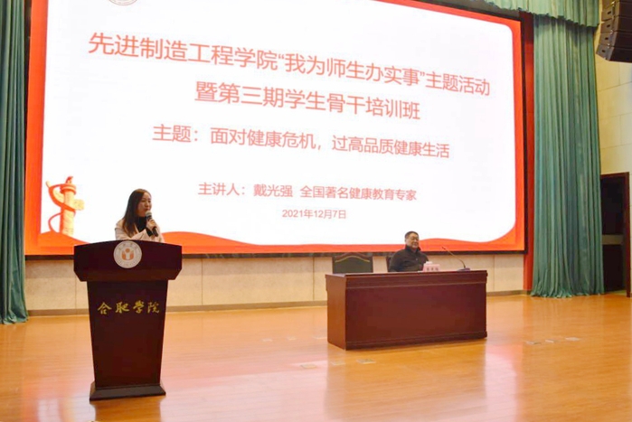 為結(jié)合黨史學(xué)習(xí)教育,深化“我為師生辦實(shí)事”主題活動開展,幫助師生養(yǎng)成良好健康的生活習(xí)慣,樹立正確生活理念,12月7日下午,我校先進(jìn)制造工程學(xué)院在圖書館報(bào)告廳舉辦“我為師生辦實(shí)事”主題活動,邀請全國著名健康教育專家戴光強(qiáng)教授來我校作健康知識專題講座,本次講座以“面對健康危機(jī),過高品質(zhì)健康生活”為主題,先進(jìn)制造工程學(xué)院全體教職工和學(xué)院學(xué)生骨干培訓(xùn)班全體學(xué)員聆聽講座。講座由先進(jìn)制造工程學(xué)院黨委書記杜娟主持。