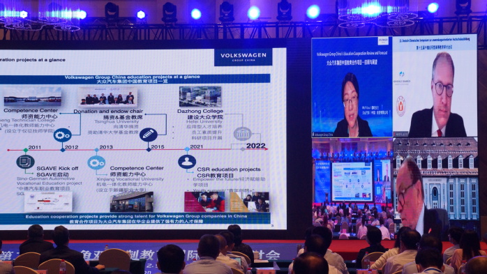 大眾汽車集團(tuán)(中國)學(xué)院、企業(yè)文化和溝通部高級總監(jiān)婁屹作題為《大眾汽車集團(tuán)中國的教育合作項目回顧與展望》的報告。她簡要介紹了大眾汽車集團(tuán)(中國)的教育合作項目、大眾汽車集團(tuán)(中國)在安徽開展的雙元制教育項目,以及與合肥學(xué)院共建的“大眾學(xué)院”的開展情況和辦學(xué)特色。