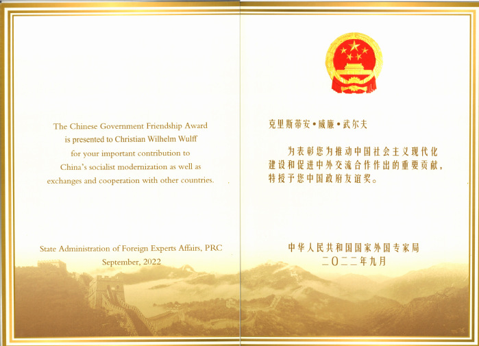 因在中德人文、教育、科技等領域友好合作做出卓越貢獻,我校與同濟大學聯合推薦的克里斯蒂安·威廉·武爾夫(Christian Wilhelm Wulff)教授榮獲2022年度中國政府友誼獎, 武爾夫教授成為我校歷史上第五位獲得中國政府友誼獎的外國專家。