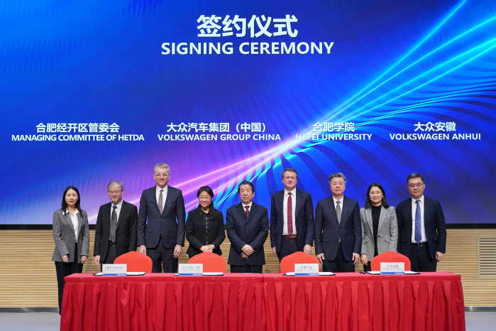 為推動產教深度融合、校企協同育人,打造“雙元制”高等教育合作范例,2月20日,大眾學院簽約揭牌儀式在合肥市中德合作創新園隆重舉辦。大眾汽車集團(中國)執行副總裁傅勤彥(Jens Pfitzinger),大眾汽車(安徽)有限公司首席執行官葛皖鏑(Erwin Gabardi),合肥學院黨委書記王其東,合肥市委常委路軍,省委教育工委委員、省教育廳副廳長儲常連出席儀式并致辭。儀式由合肥學院院長吳春梅主持。