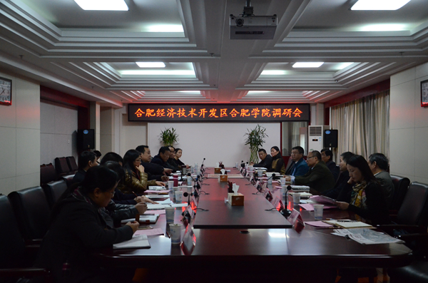 12月1日,合肥經濟技術開發區管委會工委書記、管委會副主任楊偉,工委委員、管委會副主任孫余洲等一行十人來我校調研。校黨委書記蔡敬民,紀委書記洪家友,副校長陳秀,督導鄭永紅等在行政樓九樓東會議室接待來賓,雙方就支持合肥學院建設等事宜展開深入交流。校辦、宣傳部、教務處、科技處、公管處、校園建設與管理處等部門負責人陪同與會。