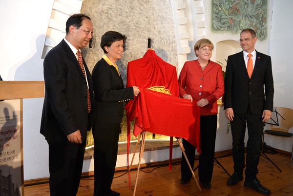 雙方致辭后,默克爾與許琳等共同為孔子學院揭牌,這是默克爾本人及德國現任總理首次為孔子學院揭牌。