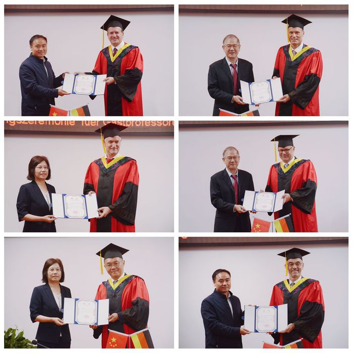 謝超、王其東、吳春梅為葛皖鏑博士等六位客座教授頒發(fā)證書(shū)。