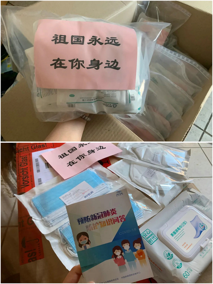 “愛心防疫包”包含N95口罩兩只、醫用外科口罩兩盒共二十只、表面消毒巾一包及《新冠防疫知識問答手冊》一份。在德國市場防疫物資相對匱乏的時刻,這份母愛顯得尤為珍貴。同學們在網上和朋友圈紛紛曬出圖片,表達對祖國溫情的感激,對使領館、在德物資提供企業及學聯工作人員奉獻愛心辛苦工作的感謝,并衷心祝愿祖國繁榮昌盛,祝福德國早日走出疫情的陰霾!