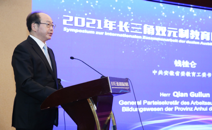 中共安徽省委教育工委書記錢桂侖在致辭中指出,“雙元制”作為一種校企合作、產教融合的教學模式,其實施離不開企業的參與。企業促進了深度培養方案、課程體系、教學內容及教學方式的改革創新,全流程參與應用型本科人才高質量培養,為培養符合企業和行業需要的應用技術人才發揮了積極作用。他希望雙方共同努力,推進產教融合、校企合作,促進“雙元制”在安徽、在長三角、在中國生根結果,努力培養更多高素質應用型技術技能人才,為全面建設社會主義現代化國家提供有力的人才和技能支撐。