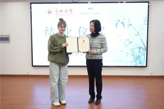 Bei der Abschlussfeier überreichte die Pr?sidentin Frau Wu Chunmei allen Studierenden, die die Prüfung bestanden hatten, Zertifikate. Sie ermutigte die deutschen Studenten, weiterhin die chinesische Sprache und Kultur zu erlernen, und hie? sie willkommen, an der Universit?t Hefei zu studieren, um an der deutsch-chinesischen Bildungskooperation teilzunehmen und die deutsch-chinesischen freundschaftlichen Beziehungen weiter auszubauen.