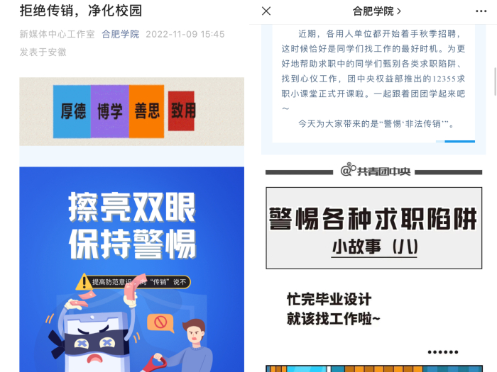 “廣”字先行,全面宣傳。合肥學院官方微信公眾號以“秋招”為切入點,通過漫畫故事等大學生喜聞樂見的形式,幫助學生識別傳銷陷阱、順利求職。各二級學院也紛紛通過宣傳欄、宣傳展板、微信、微博、QQ等渠道,向廣大學子宣傳防范傳銷知識,切實擴大校園防范傳銷宣傳教育活動的覆蓋面,營造抵制傳銷的濃厚氛圍。人工智能與大數據學院、城市建設與交通學院、旅游與會展學院、語言文化與傳媒學院充分發揮教育主體作用,把防范與打擊傳銷作為思想政治教育、新生入學教育、畢業生就業指導教育的重要內容,通過召開黨支部會議、主題班會、座談會,以及走訪宿舍、散發宣傳單頁等形式,送防范傳銷知識“上門”。