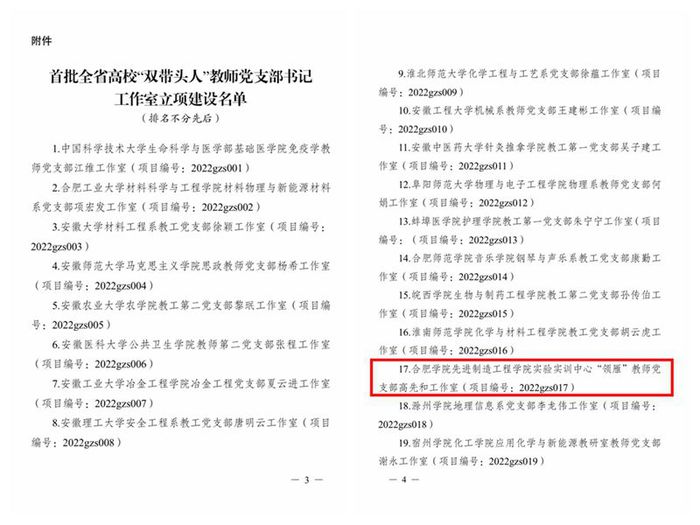 近日,中共安徽省委教育工委印發《關于公布首批全省高校 “雙帶頭人”教師黨支部書記工作室立項建設名單的通知》 (皖教工委函〔2022〕655 號),合肥學院先進制造工程學院實驗實訓中心黨支部高先和工作室成功獲評首批全省高校“雙帶頭人”教師支部書記工作室,這也是我校黨建工作取得的新突破。