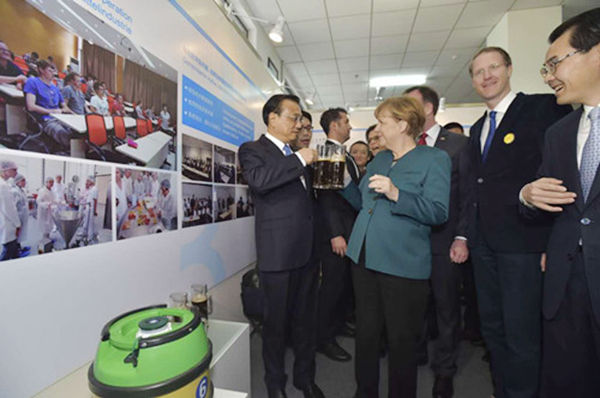 一桶德國(guó)啤酒也出現(xiàn)在展覽現(xiàn)場(chǎng)。原來(lái),過(guò)去該校食品專業(yè)的學(xué)生只會(huì)釀造黃啤,在德國(guó)師生的幫助下,后來(lái)釀起了黑啤。興致盎然的李克強(qiáng)和默克爾不由舉起酒杯,品嘗起中德合釀的美酒。