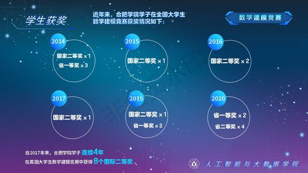 人工智能與大數據學院緊緊圍繞學校人才培養中心工作,2012年以來積極開展以學生科技創新創業為主的第二課堂工作,以學生“能力水平、專業類別和興趣愛好”為根本出發點,目前成立了: RoboCup機器人足球、數學建模、AR/VR團隊、物聯網創新設計、移動應用開發、ACM-ICPC算法設計、仿人機器人、水下機器人、區塊鏈、網絡與信息安全等16支團隊,并且專門建設了機器視覺應用、數學建模與仿真等6個學生創新實驗室、移動APP開發、多智能體系統、數據分析與仿真等8個大學生創客中心;為各團隊提供良好的環境和資源。通過這些工作的開展,人工智能與大數據學院大學生的創新創業能力逐步增強,目前有200余人常駐創新創業實驗室。近五年在師生共同努力下,在各類競賽中共獲獎800項,其中國際級21項,國家級獎項160余項、省級獎項600余項。RoboCup機器人2D仿真足球隊連續5次進入世界杯前8強,先后獲得葡萄牙公開賽冠軍、世界杯季軍等國際獎項,是世界杯、中國機器人足球賽公認強隊;此外獲得中國機器人大賽暨RoboCup公開賽曾獲得國家特等獎1項、美國大學生數學建模競賽獲得國際二等獎6項,全國大學生數學建模競賽獲得國家二等獎1項,CCPC中國大學生程序設計競賽總決賽銀牌,Robocup機器人世界杯中國賽獲得亞軍,“哈工大杯”第十六屆全國機器人錦標賽暨“博思威龍杯”第五屆國際仿人機器人奧林匹克大賽獲得國家一等獎2項,“藍橋杯”全國軟件和信息技術專業人才大賽個人賽曾獲得國家一等獎2項,“田家炳杯”第六屆全國師范院校師范生教學技能競賽國家二等獎、第二屆全國師范生微課設計大賽國家特等獎等。獲批大學生創新創業訓練計劃項目國家級86項,省級168項,獲批大學生創客實驗室項目8項,2名優秀學生獲得安徽省“創新之星”榮譽稱號。