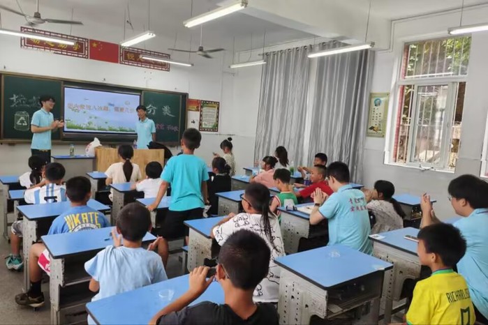 在大演鄉中心小學,團隊成員們圍繞“垃圾分類”“國家公園建設深入鄉村”“保護生物多樣性,建設環保濕地公園”等主題開展校園宣講。團隊成員們講述綠色環保故事,帶領學生學習垃圾分類知識,引導他們樹立節約環保的綠色生活理念。志愿團隊還開展了“凈灘”行動,帶領當地學生沿著秋浦河下游清理垃圾,還原大演鄉河灘美貌。