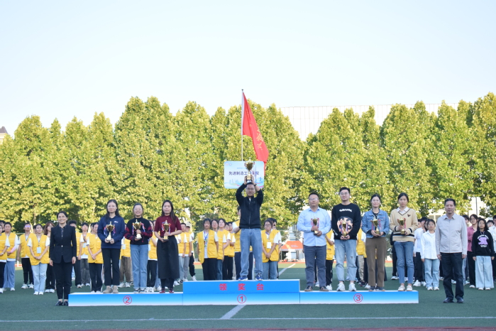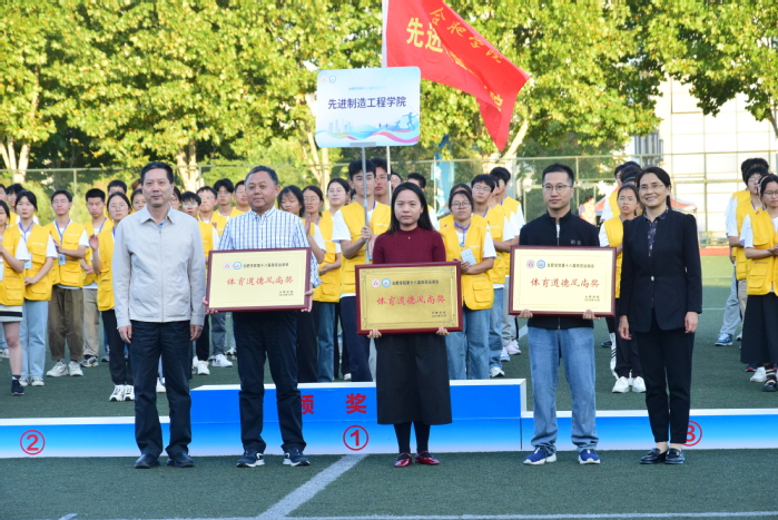 閉幕式開始,陳秀宣讀本次比賽結果:能源材料與化工學院、語言文化與傳媒學院、研究生代表隊榮獲最佳組織獎;先進制造工程學院、教育學院、人工智能與大數據學院代表隊榮獲體育道德風尚獎;先進制造工程學院代表隊榮獲團體獎第一名;人工智能與大數據學院、經濟與管理學院、設計學院代表隊榮獲團體獎第二名;教育學院、生物食品與環境學院、城市建設與交通學院、研究生代表隊榮獲團體獎第三名。校領導為獲獎單位頒獎。