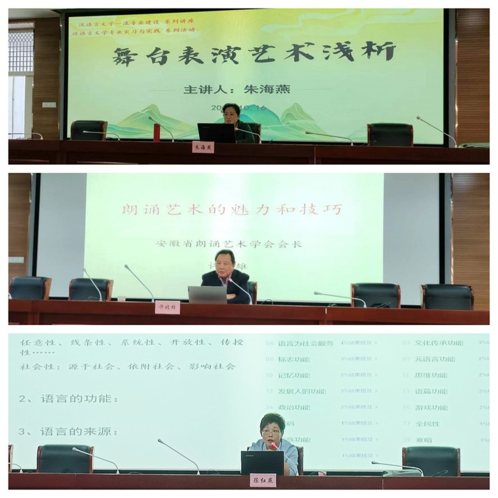 10月17日至25日,學院先后邀請了原安徽省話劇院院長、國家一級演員朱海燕,安徽省朗誦協會會長、國家一級演員許北雄,文傳學院副教授、語言學及應用語言學博士陳紅燕等專家開設了“舞臺表演藝術淺析”“淺談朗誦的藝術魅力和基本技巧”“語言與生活”系列講座。