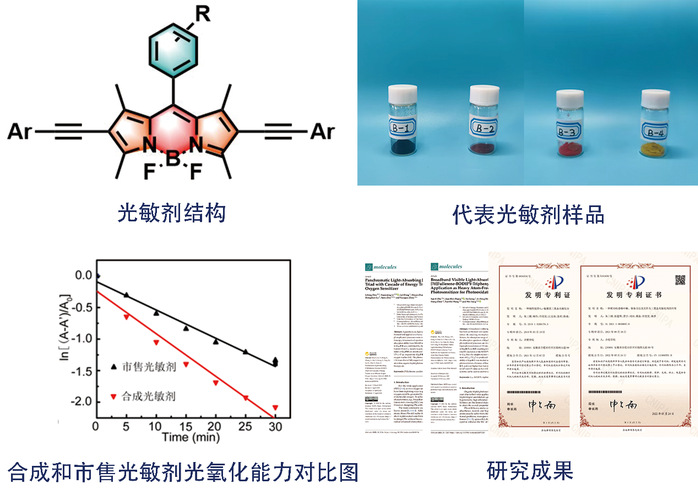 三重態光敏劑在光伏電池、光動力學療法等領域具有廣泛的應用,是實現國家“十四五”亟待解決的難題“腔內腫瘤高效靶向光動力治療方法”的核心。該項目針對傳統光敏劑的缺點和發展新型光敏劑的瓶頸問題,提出利用化學合成手段,調整氟硼熒的共軛結構以及引入自旋轉換單元,合成了系列具有穩定系間竄越能力、在可見-近紅外光區具有較強光捕獲能力、較長三重激發態壽命和較高單線態氧量子產率的光敏劑。基于此項目,共獲授權發明專利2項、發表SCI收錄論文2篇、簽訂企業委托研發項目1項。