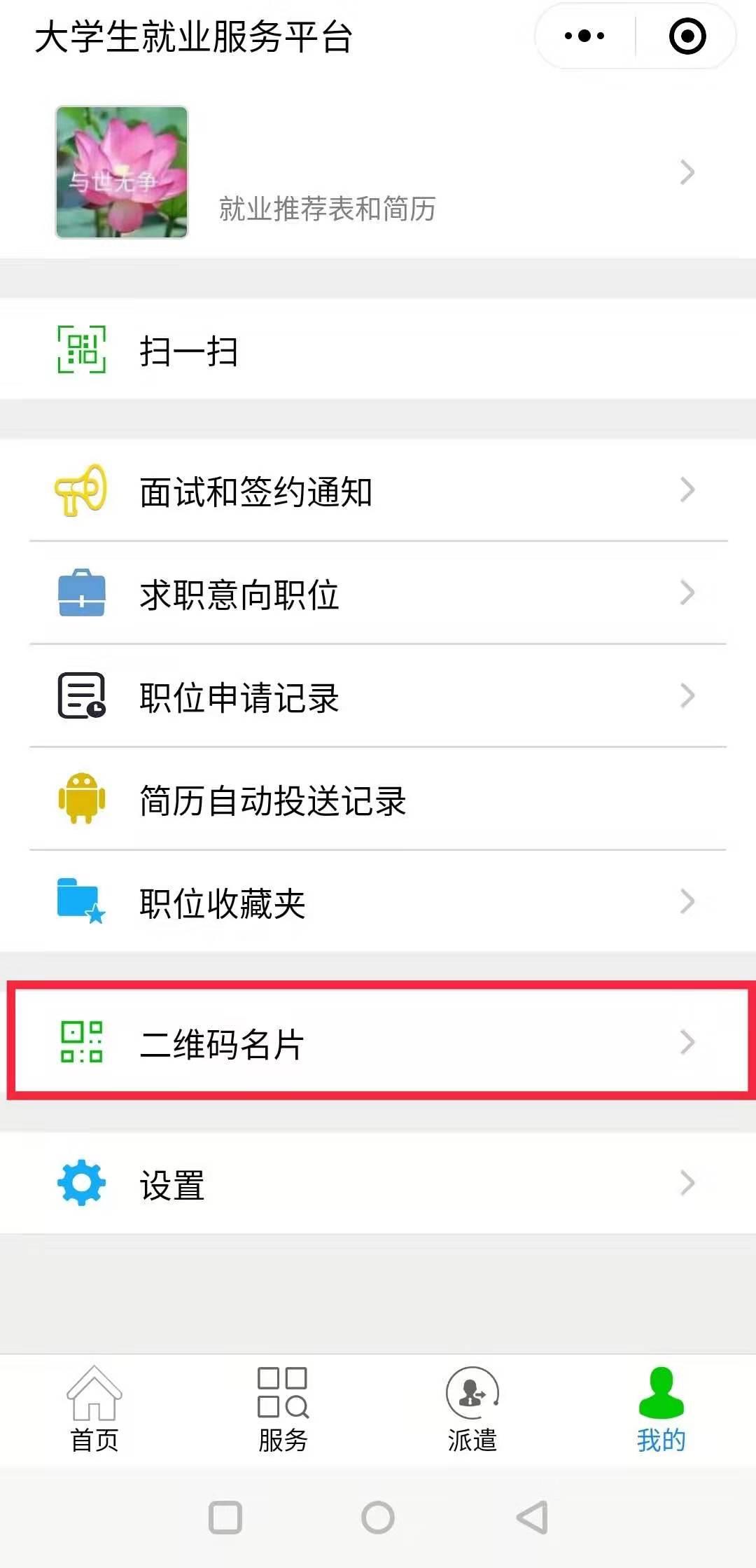 第一步、畢業生在“我的”中打開“二維碼名片”,向用人單位招聘人員發送二維碼,并告知使用微信掃描二維碼。