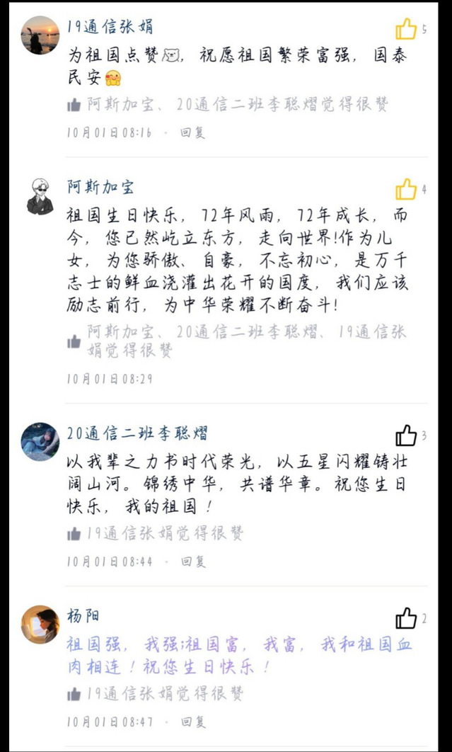 通信工程學生黨支部為慶祝祖國成立72周年,10月1月,通信工程學生黨支部通過官方QQ發布國慶節相關動態,在中華人民共和國成立72周年之際,通信工程學生黨支部官方QQ號邀請眾多師生為祖國慶生,共同寫下對祖國的美好祝福。