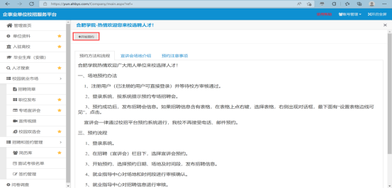 1.企業(yè)端登陸網(wǎng)址:https://yun.ahbys.com/Company/,選擇“校園就業(yè)市場(chǎng)”中“專場(chǎng)宣講會(huì)”,點(diǎn)擊“我要預(yù)約”。