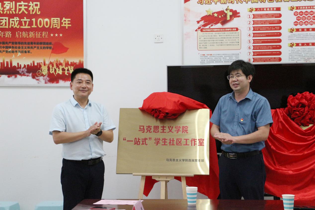 隨后,陳志超、杜娟和陶龍澤共同為“馬克思主義學院‘一站式’學生社區工作室”、馬克思主義學院直屬黨支部和“啟航”全國黨建樣板支部“聯學共建基地”揭牌。揭牌儀式后,與會師生共同參觀了“一站式”學生社區學生活動空間。馬克思主義學院黨員教師紛紛表示,在學校“一站式”學生社區綜合管理模式改革創新工作中,作為思政課教師要貢獻一份力量,在黨的創新理論宣講、時事熱點解讀、紅色經典著作領學、理論性學習社團指導、專業心理咨詢、學生“大創”項目指導、社會實踐團隊指導和助力輔導員隊伍職業化專業化水平提升等方面,與學校其他力量一起共同做好大思政課育人這篇文章。