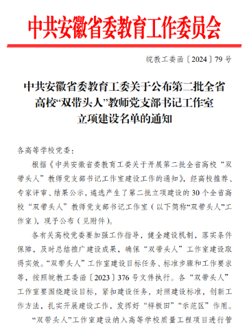 近日,中共安徽省委教育工委印發《中共安徽省委教育工委關于公布第二批全省高校“雙帶頭人”教師黨支部書記工作室立項建設名單的通知》(皖教工委函〔2024〕79號),合肥大學先進制造工程學院智能制造工程系“領智”教工黨支部谷曼工作室成功獲評全省第二批高校“雙帶頭人”教師支部書記工作室。學院基層黨建工作再創新佳績。