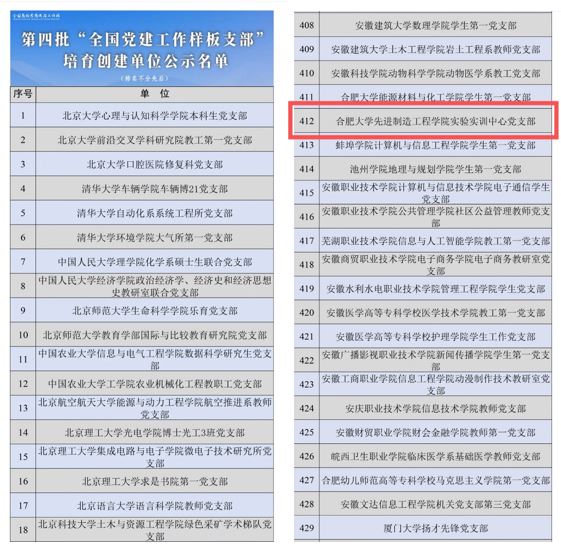 近日,教育部公示了第四批新時代高校黨建示范創建和質量創優工作遴選結果,先進制造工程學院實驗實訓中心黨支部成功入選“全國黨建工作樣板支部”培育創建單位公示名單。