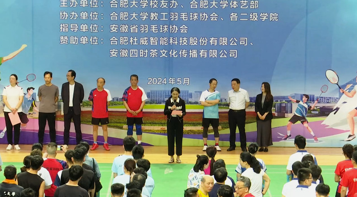 5月18日,合肥大學第一屆“杜威杯”校友羽毛球邀請賽在我校體育館成功舉辦。比賽由校友辦公室和公共體育與藝術教學部共同主辦,校教工羽毛球協會、各二級學院協辦,安徽省羽毛球協會指導,共邀請15支代表隊近130名運動員參賽。副校長陳秀致辭。