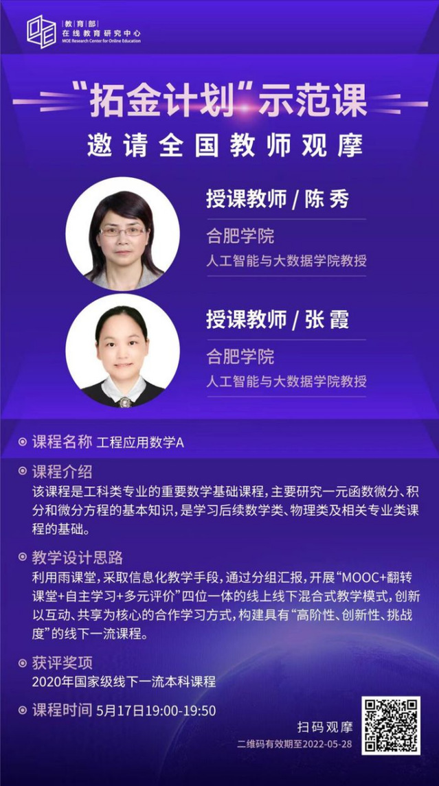 Launched in 2021 by the Online Education Research Center of Chinas Ministry of Education, the “Project Gold” is a nationwide plan to develop more excellent courses and lectures. Upon strict evaluation, Applied Engineering Mathematics A, together with the other 96 courses, was selected from over ten thousand state-level or provincial-level excellent undergraduate courses, into the first batch of the project, which is a great fruit of the HFU math teaching team for their 15-year reform.