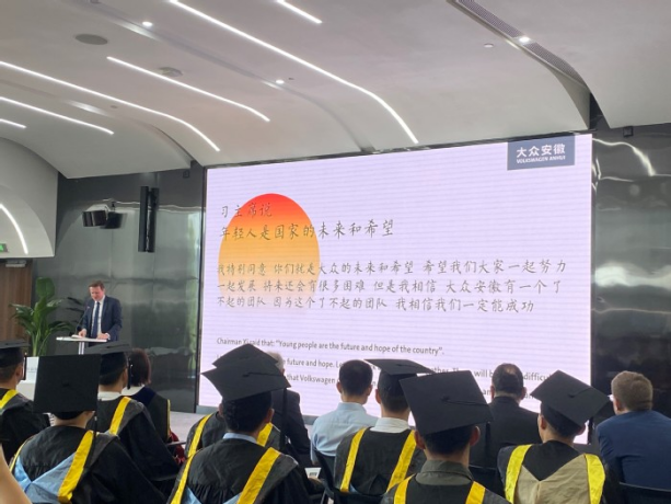 The morning of June 16 sees the graduation ceremony at Volkswagen Anhui of the first batch of “Seed Engineers” jointly trained by HFU and Volkswagen Group China. Wu Chunmei, HFU President, attends the ceremony together with Mr. Jens Pfitzinger, Volkswagen Group Executive Vice-president and Dr. Gabardi, CEO of Volkswagen Anhui.