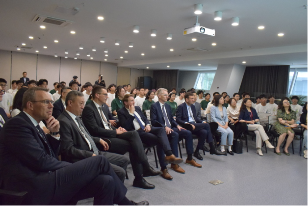 On the afternoon of May 26, HFU President Wu Chunmei extends a warm welcome to the delegation of Volkswagen Group led by Gunnar Kilian, member of its Management Board and Director of Human Resources Management.
