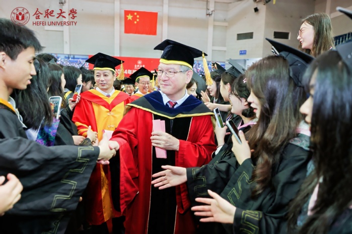 典禮最后,校領(lǐng)導(dǎo)、校學(xué)位評定委員會成員與在場畢業(yè)生握手送別、合影留念。