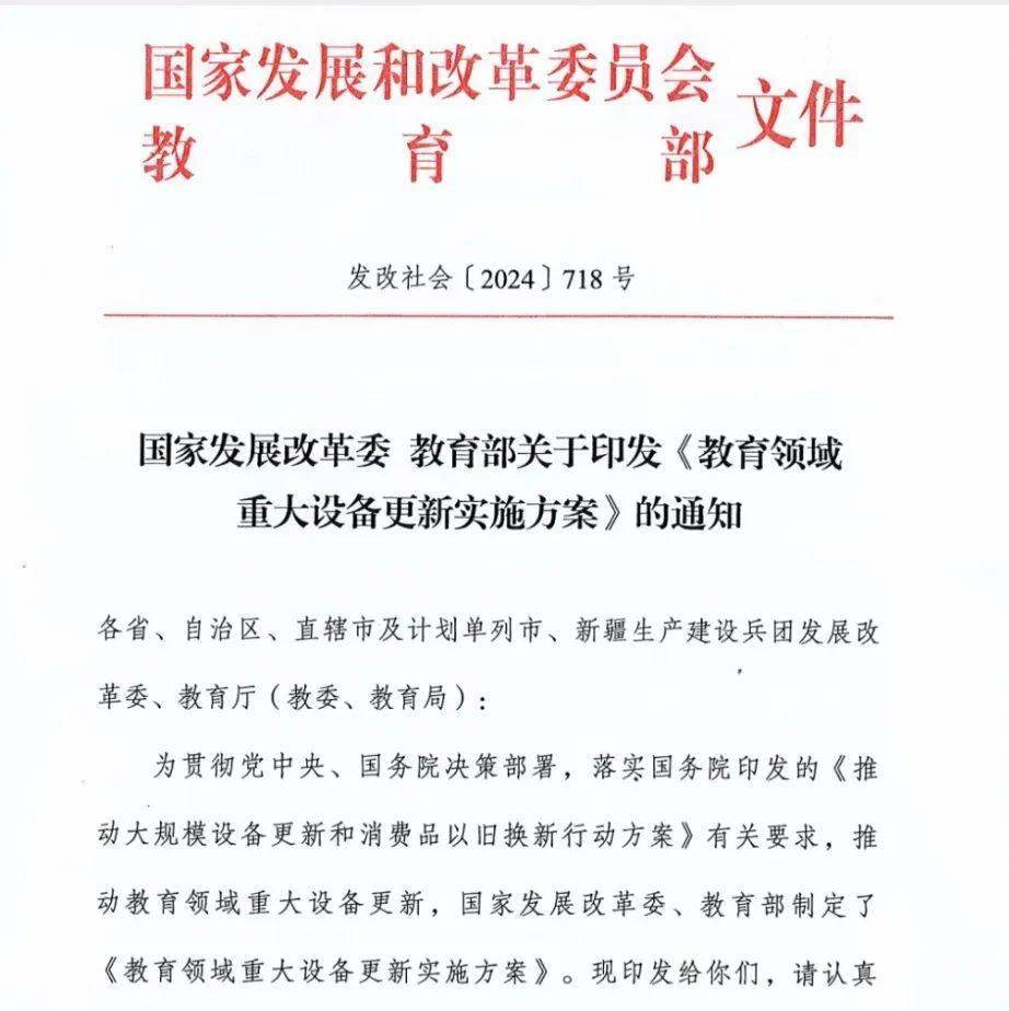 為響應黨中央、國務院關于推動大規模設備更新和消費品以舊換新的決策,國家發改委、教育部制定并印發《教育領域重大設備更新實施方案》,以促進教育領域重大設備更新,主要涵蓋普通高校與職業院校的關鍵設備升級,旨在支持科技創新與高質量教育發展。以下為方案全文: