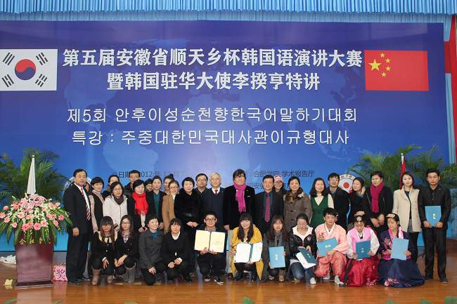 12月7日,由韓國駐華大使館文化宣傳部、中國安徽省教育廳主辦,韓國順天鄉大學、中國合肥學院承辦,中國-合肥韓國中心、韓大文化交流有限公司協辦的第五屆安徽省“順天鄉”杯韓國語演講大賽在我院圖書館學術報告廳順利舉行。韓國駐華使館新聞參贊河賢鳳、安徽省教育廳外事處處長耿尊芳女士、韓國順天鄉大學總長孫豐三先生,合肥學院院長蔡敬民、紀委書記洪家友出席大賽開幕式。此次比賽由韓國駐華使館新聞參贊河賢鳳,韓國駐上海總領事館洪元一,韓國順天鄉大學總長孫豐三、國際交流本部部長吳允盛、中文學院院長樸炯春教授、安柱鎬教授及合肥學院韓國語教授趙誠惠擔任評委。