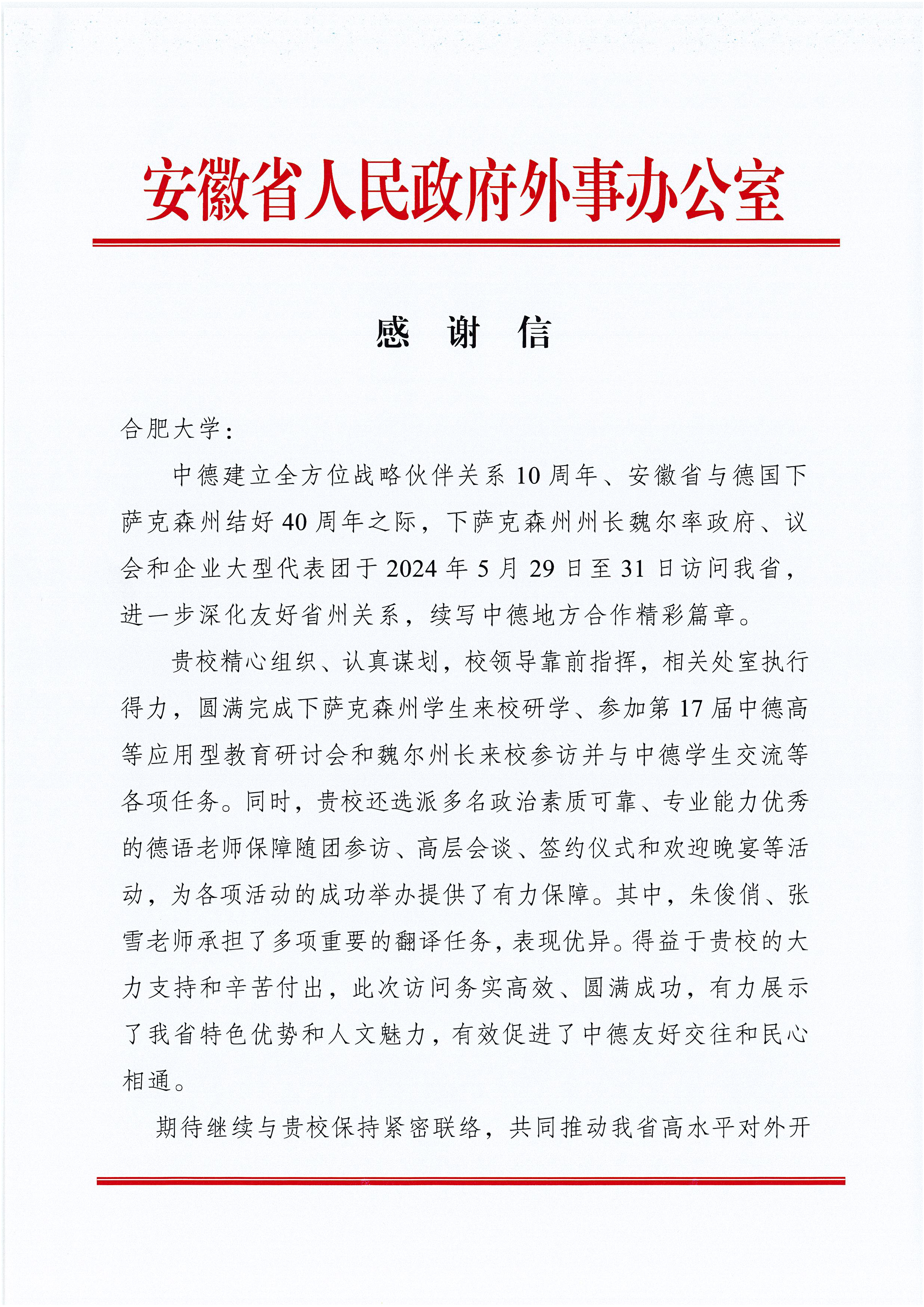 信中表示,在安徽省與下薩克森州結好40周年之際,下薩克森州州長代表團近期訪問我省。在省委、省政府的堅強領導和安徽省外辦的有力指導下,我校圓滿完成各項任務,進一步深化友好省州關系,續寫中德地方合作精彩篇章。
