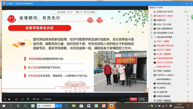 疫情當前,黨員先行,為了落實立德樹人根本任務,增強當代大學生的責任意識。2020年5月26日中午,經濟與管理學院黨委副書記張永軍利用QQ群課堂平臺,通過視頻會議的方式,為經濟與管理學院入黨積極分子上了一節題為《讓黨旗在每場“戰疫”第一線高高飄揚》的特殊黨課。