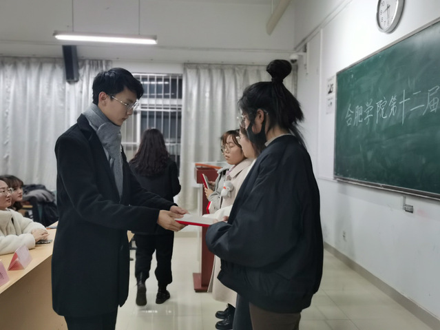 2020年11月28日,合肥學(xué)院第十六屆校園文化藝術(shù)節(jié)之自薦書大賽頒獎儀式于我校一區(qū)博學(xué)樓B座303教室順利舉行。出席頒獎儀式的嘉賓為經(jīng)濟(jì)與管理學(xué)院第二屆學(xué)生會主席團(tuán)全體成員及比賽獲獎?wù)邆儯瑑x式由權(quán)益部部長羅一主持。