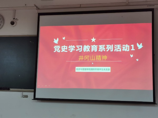 為慶祝中國(guó)共產(chǎn)黨建黨100周年,深入學(xué)習(xí)黨的光輝歷史和偉大精神,重溫中國(guó)共產(chǎn)黨帶領(lǐng)人民謀幸福、為中華民族謀復(fù)興的艱辛探索歷程,堅(jiān)定黨員理想信念,經(jīng)濟(jì)與管理學(xué)院國(guó)際貿(mào)易學(xué)生黨支部于4月15日晚九十節(jié)課在一期博學(xué)樓B座307教室舉辦學(xué)生黨員黨史學(xué)習(xí)教育系列活動(dòng)一·精神學(xué)習(xí)·(二)井岡山精神。