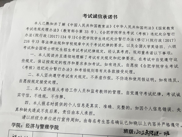 輔導員在所帶班級召開主題班會,領學《國家教育考試違規處理辦法》(教育部令第33號)、《合肥學院學生考試(考核)違紀處分暫行辦法(院行政〔2017〕134號)》《合肥學院學生違紀處分暫行辦法(修訂)(院行政〔2017〕216號)》等法律法規和學校規章、以及全國大學英語四、六級考試和全國碩士研究生招生考試考試紀律規定,教育學生知曉考試違規違紀后果,自覺規范考試行為。加強社會主義核心價值觀宣傳教育,引導學生認識到嚴格遵守考風考紀既是踐行個人考試誠信承諾、展示自我良好風貌的基本方式,又是維護社會公序良俗、身體力行促進社會公平公正的重要途徑全體學生在考試誠信承諾書簽名,鄭重承諾嚴格遵守考試紀律。