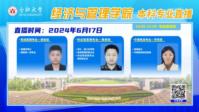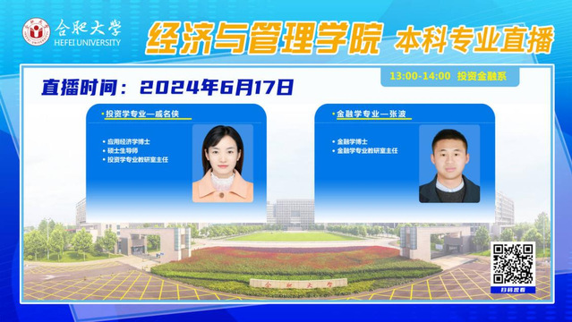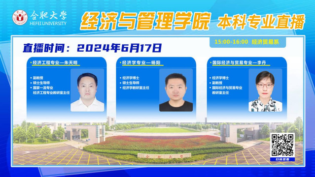 2024年6月17日,合肥大學經濟與管理學院各專業負責人走進直播間,通過在線直播的形式,連接學生與高校,讓未來的大學生們在屏幕前就能夠深入了解我院的本科專業設置、課程內容、師資力量、就業前景及校園生活等方方面面的信息。