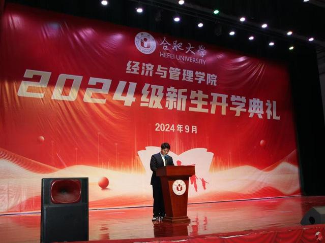 典禮開始前,由啦啦操隊和和舞蹈隊帶來的節目表演拉開典禮序幕,伴隨著莊嚴肅重的國歌,典禮正式開始。24級本科生新生代表陳李潔、24級研究生新生代表徐舒欣分別對未來的校園生活進行了暢想,經管學院學生會主席張毅就大學的學習生活經驗做了分享。隨后,財會系主任鄭姍姍老師對新同學的到來表示熱烈歡迎,鼓勵他們在大學階段奮發向上,最后經管學院院長陳江華為24級新同學帶來開學第一課,勉勵新同學保持積極向上的人生態度,不斷磨練,勇于創新,現場氣氛熱烈。