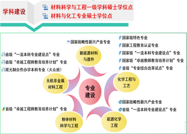 學院擁有碩士和學士二級學位授予權。現有“材料科學與工程”一級學科碩士學位以及“材料與化工”專業碩士學位兩個授權點,已形成了區域優勢明顯、目標明確的材料保護與安全、材料化工與環保、新能源材料與技術三個特色方向。現有化學工程系以及材料科學與工程系,分別設立“化學工程與工藝”和“能源化學工程”2個本科專業,以及“無機非金屬材料工程”、“粉體材料科學與工程”和“新能源材料與器件”(2022年獲批)3個本科專業。化學工程與工藝專業為國家級特色專業、國家級和安徽省一流本科專業建設點,并率先在全校通過教育部工程專業認證。能源化學工程和無機非金屬材料工程專業均為安徽省一流本科專業建設點。學院與德國企業以及區域重點企業開展深度雙元制本科合作辦學和研究生培養,與大眾汽車(安徽)有限公司合作創辦無機非金屬材料工程(電池技術方向)“大眾班”,也是我校“大眾學院”重點打造的本科專業之一。