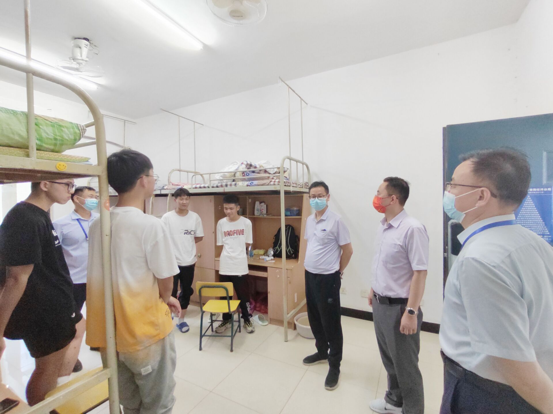 走訪中,學院領導親切的詢問各位新生都來自哪里,囑咐新生們要盡快適應集體生活,提醒同學們要按時參加晚上的班會,同時強調在疫情防控常態化期間,要高度重視宿舍的安全和衛生,勤開窗通風,保持宿舍干凈整潔,做好個人衛生防護,戴好口罩,堅持每日今日校園打卡,完成三天兩檢。同時,鼓勵同學們養成良好的學習、生活習慣,明確學習目標,以良好的精神面貌開啟自己的大學生活。